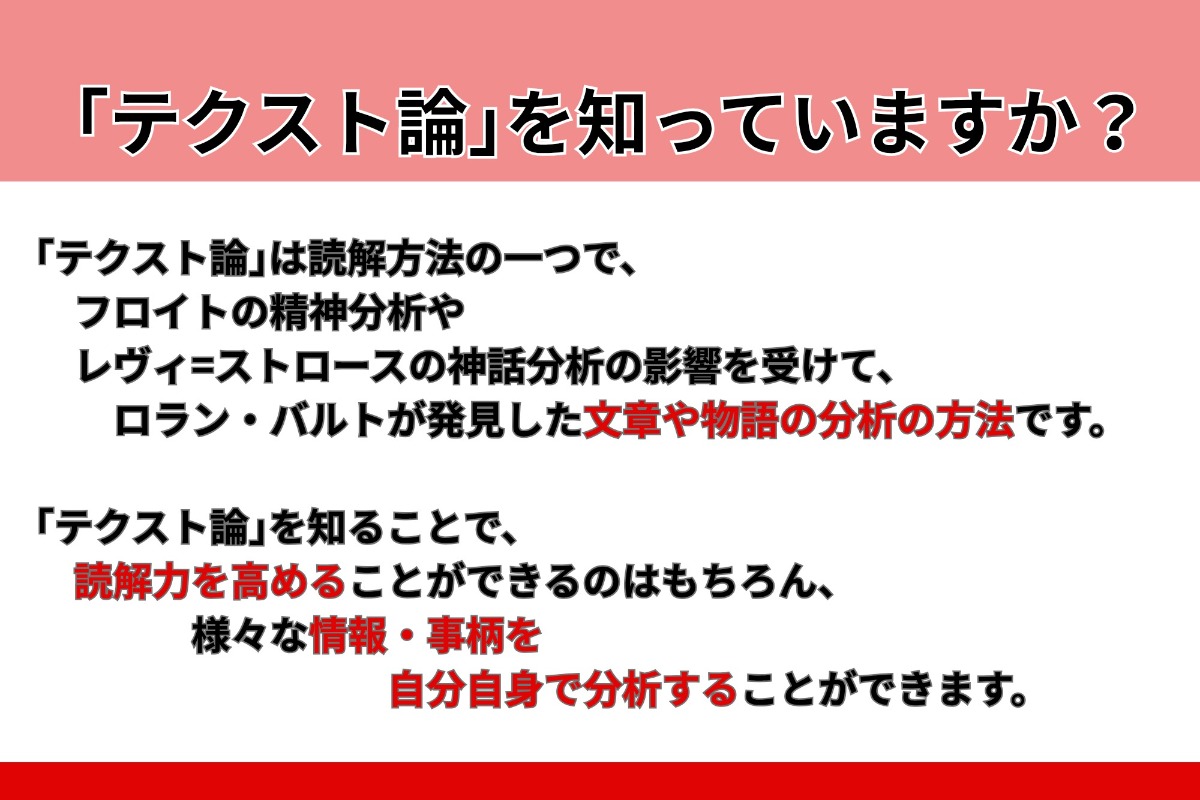 「テクスト論」的な読解を身につけることで、「人間が文章を読む」という行為を分析的に理解し、文章をはじめとした私たちの身のまわりにあふれる「意味するもの」の理解を更に深めることができます。