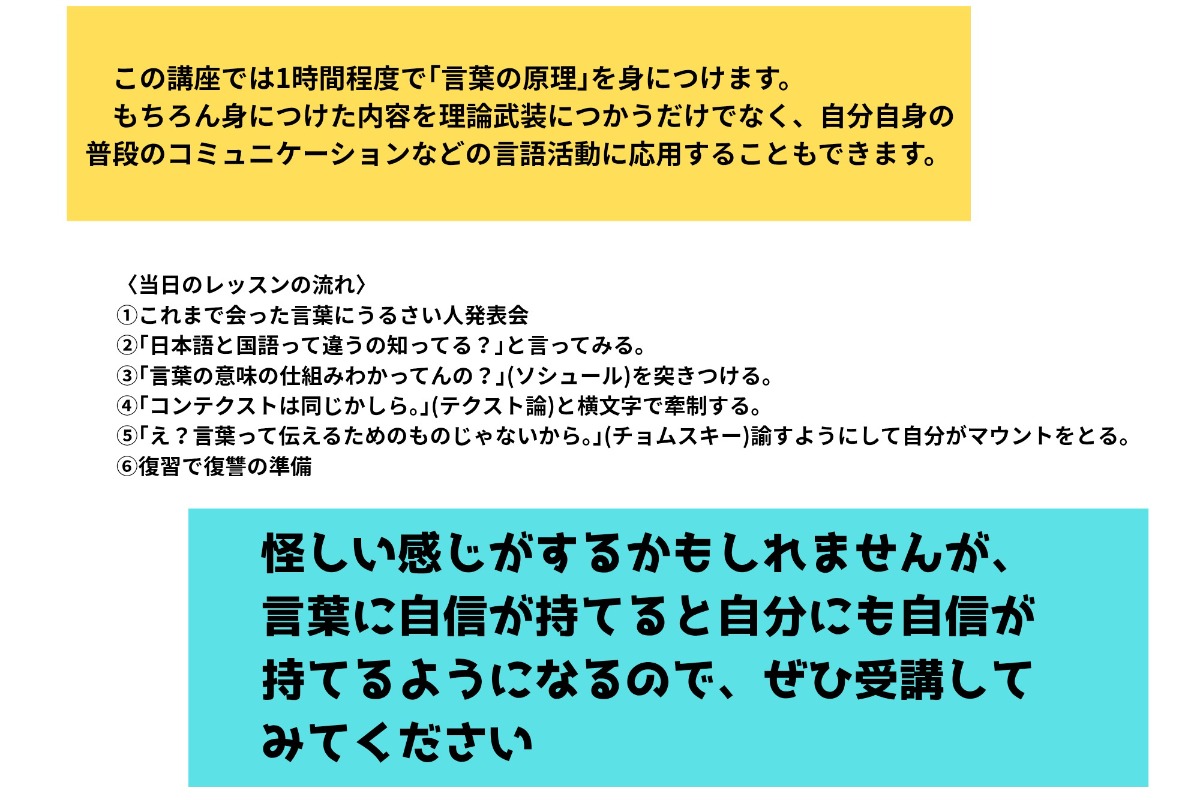 そもそも言葉遣いの注意の定番「正しい日本語(タダシイニホンゴ)」という言葉自体が間違っている、ということから始まるこの講座は、言葉について持論を展開して注意してくる厄介者に対処する術を身につけるための講座です。